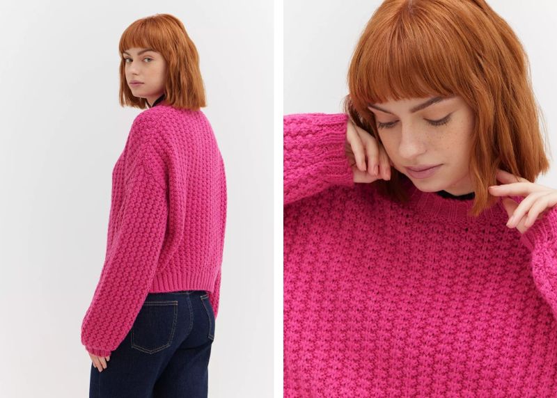 - Prostokąt – niewielkie wcięcie w talii. Tutaj warto postawić na swetry z detalami, np. paskiem w talii lub fakturą dzianiny, które stworzą wrażenie krągłości.