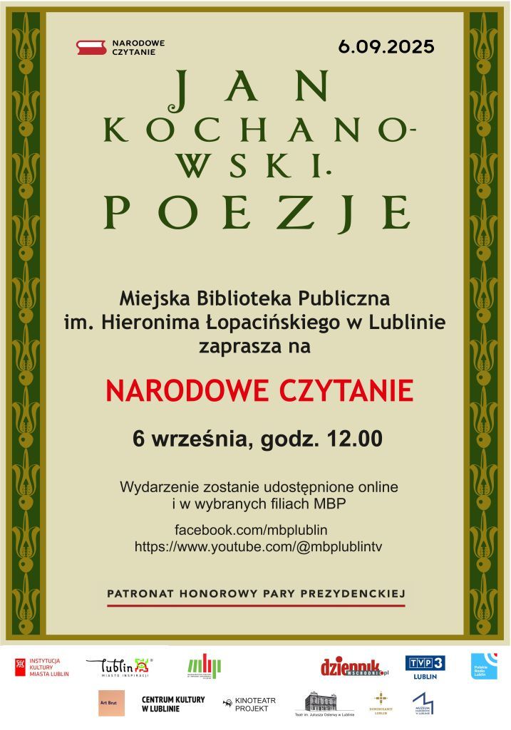 Miejska Biblioteka Publiczna im. Hieronima Łopacińskiego w Lublinie zaprasza do obejrzenia autorskiej interpretacji utworów Jana Kochanowskiego w wykonaniu naszych pracowników. W tym roku ponownie będzie to filmowy zapis czytania performatywnego z elementami inscenizacji. Nagranie odbyło się w wybranych przestrzeniach miejskich (Zamek – Muzeum Narodowe, Kościół Ojców Dominikanów, Trybunał Koronny, Pomnik Jana Kochanowskiego, zielone tereny lubelskiego Wrotkowa). Ubrani w stroje z epoki pracownicy Biblioteki, dzięki uprzejmości dyrekcji Teatru im. Juliusza Osterwy w Lublinie, starali się odtworzyć atmosferę czasów renesansowego twórcy.