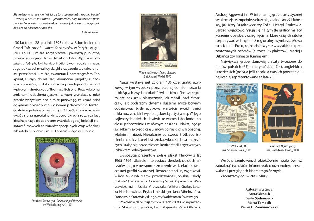 Wojewódzka Biblioteka Publiczna im. Hieronima Łopacińskiego w Lublinie zaprasza na wystawę pt. „W 130. rocznicę powstania kinematografu – wystawa plakatów filmowych ze zbiorów specjalnych Wojewódzkiej Biblioteki Publicznej im. Hieronima Łopacińskiego w Lublinie”.