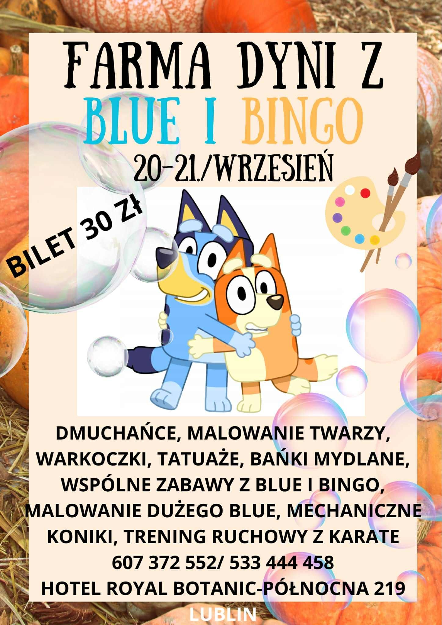 – możliwość wzięcia udziału w warsztatach ,, stwórz własnego blue” ( obowiązują zapisy pod nr tel 607 372 552, 533 444 458 najlepiej SMS) cena warsztatów 20 zł za dziecko, tylko dla gości Farmy dyniowej